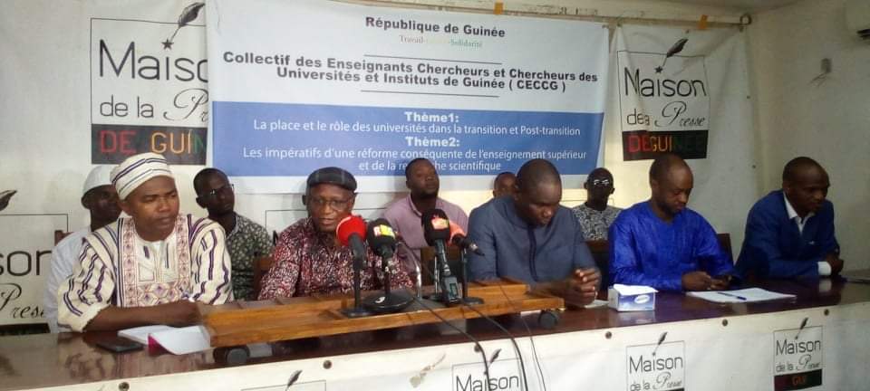 Le collectif exprime ses préoccupations aux nouvelles autorités de la transition .En prélude à la conférence de presse ,a la maison des journalistes ,le collectif des enseignants chercheurs ont remercié les médias .le président juriste constitutionnaliste monsieur fayinba Mara affirme qu il faut bien reconnaître la volonté d aider le système éducatif du CNRD est a apprécier mais il faut savoir que l enseignement supérieur est marginalisés , nous amène à décliné le but de l’organisation de cette conférence.l université locomotive de la nation, doit reprendre sa place dans notre pays en cette période de transition est de contribuer de façon significative au progrès de la nation a travers des propositions de solutions , mémorandum pour la réforme du système du pays.Car l université a une mission de recherche cette mission permet la production du savoir qui est la capital sociale le plus précieux comme l or ,le diamant, c’est elle qui est la source du développement du monde prenons exemple des grandes Bretagne,les USA l’origine de cette essor technique et technologique est le savoir.le moment est venu de sortir de l’isolement pour faire face au problème du citoyen de la société ,les problème de refondation de la nation qui l une des missions de la charte du CNRD .il est aussi important que l opinion national et international sache que des nombreux actions ont impactés positivement le système éducatif, nous recommandons au CNRD d investir à la formation des formateurs .il son nombreux les enseignants chercheurs qui ont besoin de formation manque d’accompagnement dans leurs formations qui dans d’autres sens contribuera efficacement au qualification de l’enseignement supérieur disait monsieur le professeur titulaires ancien recteur de l université sonfonia Mr Mamady kourouma