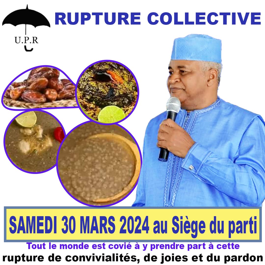 A L’occasion du mois saint de ramadan, le Bureau Exécutif National du parti Union pour le progrès et le renouveau (UPR),serait très heureux de vous compter parmi ses invités de marque à la conférence Islamique qu’il organise, comme il est coutume ,le samedi 30 Mars 2024 de 14 h 30 à 18h 45 au Siège du parti ,au quartier Minière, Commune de Dixinn.